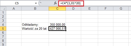 Takiej operacji dokonamy stosując wzór na procent składany. Kapitał bieżący należy przemnożyć razy 1,01 podniesione do potęgi odpowiadającej ilości lat (u nas 20).