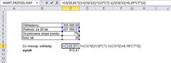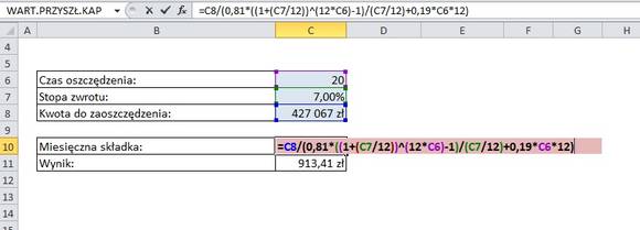 WARTOŚĆ_PRZYSZŁA – wartość przyszła lub saldo gotówkowe, do którego zmierza się po dokonaniu ostatniej płatności. Z tego argumentu korzystamy zamiast powyższego, chcąc obliczyć miesięczną kwotę oszczędności.