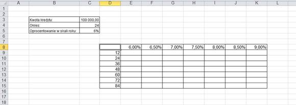Przygotowałem – na razie jeszcze pustą – tabelę. W wierszu mamy poziom oprocentowania, w kolumnie – czas trwania kredytu (okresem jest dla nas miesiąc).