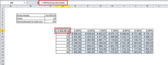 Teraz wykorzystajmy trick, który omówiliśmy sobie w jednym z poprzednich artykułów – tabelę danych. Przypomnę, że przedstawia ona wyniki różnych kombinacji wykorzystywanych w równaniu. My ustalamy, że bierzemy kredyt na 100 tys. zł, ale chcemy sprawdzić, ile wynosić będzie rata przy różnym poziomie oprocentowania i różnym okresie spłaty. Jak to zrobić?