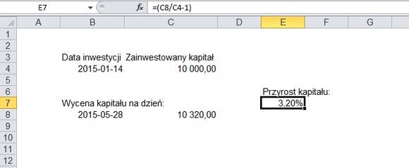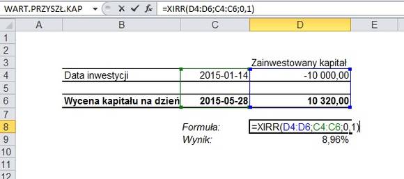 Nasza wartość to zakres uwzględniający zainwestowany kapitał (otwiera on zakres) i jego wycena (zamknięcie zakresu). Różnica w wycenie zostanie odniesiona do zainwestowanego kapitału i daty dokonania inwestycji. Data również stanowi zbiór rozpoczynający się w dniu dokonania inwestycji, zamykając na dniu wyceny. Wynik jest argumentem opcjonalnym.