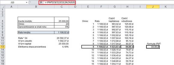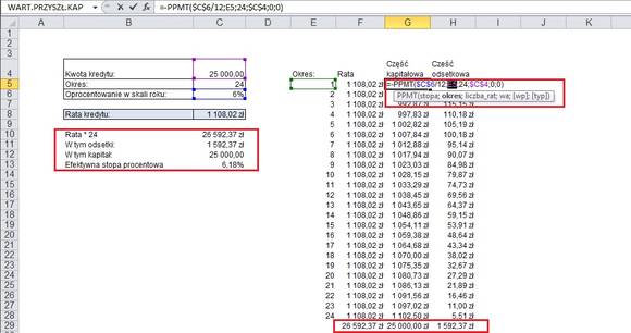 Formuła działa analogicznie do poprzedniej. Stopa procentowa to stopa roczna, podzielona na ilość okresów (u nas 12), okres to numer danego miesiąca, dla którego dokonywane są obliczenia. Liczba rat to ilość miesięcy, a kapitał początkowy to kwota zaciągniętego kredytu.