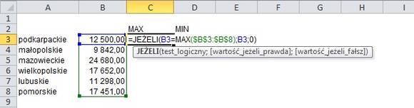 Chcąc użyć tych informacji celem pokazania ich na wykresie, musimy sprawdzić każdą wartość, określając czy jest maksymalną lub minimalną z zakresu. W tym celu użyjemy funkcji JEŻELI. Przypomnę, że funkcja JEŻELI sprawdza test logiczny, u nas będzie nim: