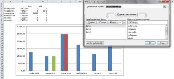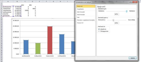 Na razie wykres nie wygląda zbyt sensownie – kolumny z wartościami przypisanymi województwom i z formułami wartości maksymalnych i minimalnych tworzą trzy serie danych, tj. teoretycznie występują one na wykresie tuż obok siebie. W praktyce tego nie widać, gdyż jednemu województwu przypisane są co najwyżej dwie wartości. Teraz wystarczy jednak tylko „nałożyć” na siebie wszystkie serie przypisane poszczególnym wykresom.