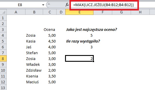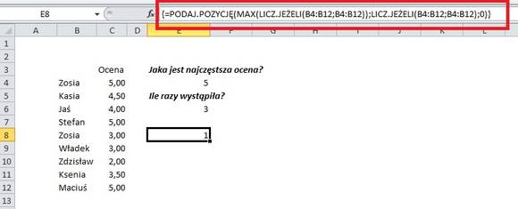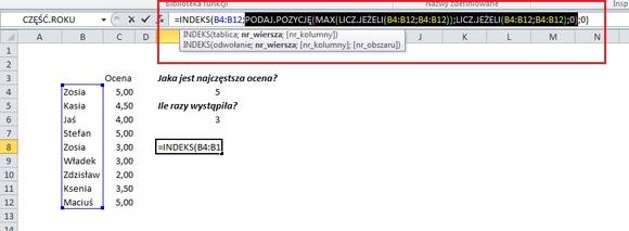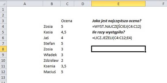 Stosunkowo łatwo i szybko można odpowiedzieć sobie na pytania: jaka ocena występuje najczęściej? (formuła WYST.NAJCZĘŚCIEJ) i ile razy ona wystąpiła? (formuła LICZ.JEŻELI). Nasze pytanie jest jednak nieco bardziej skomplikowane dla Excela. Standardowe formuły poskutkują błędem pracując na formacie tekstowym.