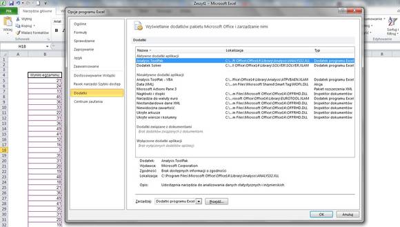 Standardowo Excel nie posiada możliwości rysowania histogramów. Należy zaopatrzyć program w dodatek Analiza danych. Jeżeli do tej pory tego nie zrobiliście, to można to szybko zmienić. Wystarczy wejść w ustawienia Excela.