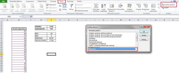 Z listy należy wybrać Analysis Toolpak. Do możliwości tego dodatku dostaniemy się z formatki Dane.