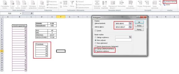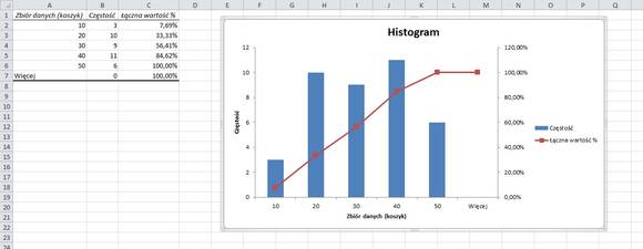 Histogram to swego rodzaju wykres, który pokazuje dane agregowanego w zbiorach. Dla nas takimi zbiorami będą poszczególne przedziały punktowe – np. do 10, do 20, do 30, do 40 i do 50.