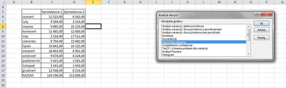 Mamy dane odnośnie sprzedaży dwóch handlowców. Jedną z możliwości szybkiej analizy tych danych, pomijając niezastąpione „na oko”, jest Statystyka opisowa, która skrywa się w opcjach dodatku Analiza danych. Wejdźmy zatem ponownie do tej zakładki, tym razem wybierając: Statystyka opisowa.