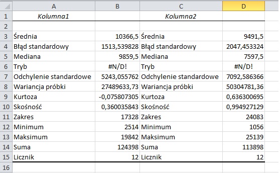 W nowym okienku mamy już wyłożone na tacy najbardziej podstawowe miary statystyczne, które już dają nieco lepszy pogląd na kształtowanie się osiągnięć handlowców. Widzimy chociażby, że w przypadku pierwszego nie tylko średnia i mediana są wyższe, ale i mniejsze jest odchylenie standardowe, stąd można oczekiwać, że jego sprzedaż z miesiąca na miesiąc nie będzie drastycznie się różnić. Mamy też podane minimum, maksimum sprzedaży, jak i wynikający z tych dwóch wartości zakres.