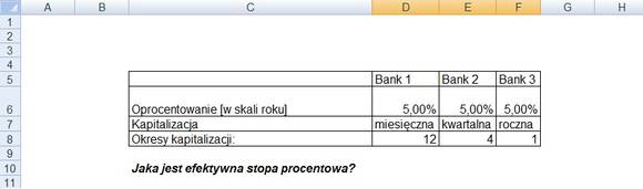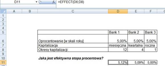 Kapitalizacja to inaczej naliczanie odsetek. Jej częstotliwość oznacza więc, jak często do naszego rachunku dopisywane są odsetki. Gdy mamy do czynienia z kapitalizacją miesięczną, wówczas co miesiąc nasz kapitał powiększa się o dodatkowe środki. W kolejnym miesiącu oprocentowanie jest liczone od naszego kapitału powiększonego o dotychczasowe, narastające odsetki. Teoretycznie więc, najwyższe efektywne oprocentowanie, będzie tam, gdzie najczęstsze są kapitalizacje (w przypadku jednakowego oprocentowania). Aby się o tym przekonać, wystarczy zastosować formułę =EFEKTYWNA, dla której argumentami są: oprocentowanie oraz okresy kapitalizacji.