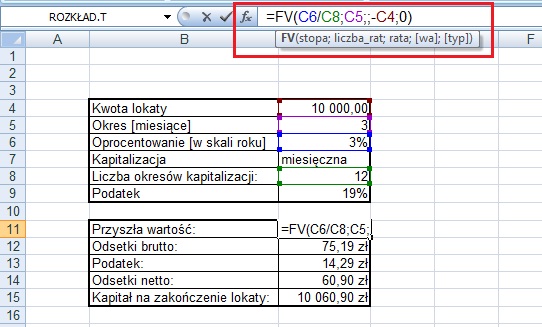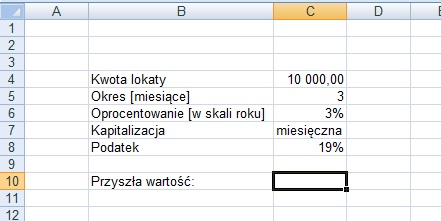Do obliczenia realnych zysków z lokaty wykorzystamy jedną z podstawowych formuł finansowych – Future Value, tj. FV. W tym przykładzie założymy, że kapitalizacja jest miesięczna, a oprocentowanie jest skali roku. Później ten przykład będziemy nieco modyfikować.