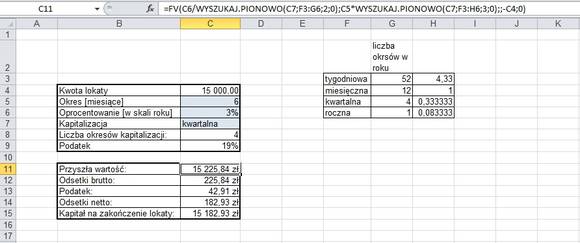 – stopa – jest to stopa procentowa, podzielona przez liczbę okresów kapitalizacji. W przypadku miesięcznej kapitalizacji jest to 12 okresów (3%/12), w przypadku kwartalnej – 4 (3%/4). Korzystając z funkcji WYSZUKAJ.PIONOWO, wyszukujemy ilość okresów, odpowiadających częstotliwości kapitalizacji, zdefiniowanych w tabeli obok. 3% będzie więc dzielone przez 12, gdy kapitalizacja jest miesięczna, przez 4, gdy będzie kwartalna, itd.