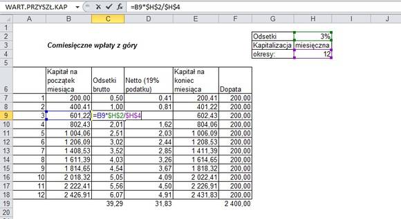Ja w takich sytuacjach preferuję korzystanie z prostej tabeli. Zakładając, że wpłaty mają miejsce na początku miesiąca (z góry), co miesiąc dopłacamy po 200 zł, a oprocentowanie wynosi 3% w skali roku, możemy łatwo skonstruować przebieg kształtowania się kapitału. Zaczynamy od kapitału 200 zł. Następnie liczymy od niego odsetki, mnożąc przez 3%/12, a następnie odejmując podatek (odsetki*0,81). Odsetki + kapitał z początku miesiąca, daje kapitał na koniec miesiąca i początek następnego, itd.