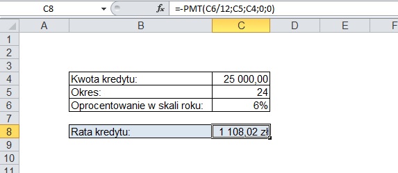Zakładając więc, że – jak na zdjęciu poniżej – chcemy zaciągnąć kredyt na 25 tys. zł, przy oprocentowaniu wynoszącym 6% w skali roku, na okres 3 lat, możemy łatwo policzyć naszą ratę kredytu: