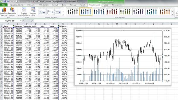 Druga rzecz to taka, że dane muszą być ułożone według ściśle określonej kolejności. Excel umożliwia stworzenie kilku rodzajów wykresów, np. uwzględniających wolumen lub nie. My weźmy za przykład najbardziej rozbudowany wariant.