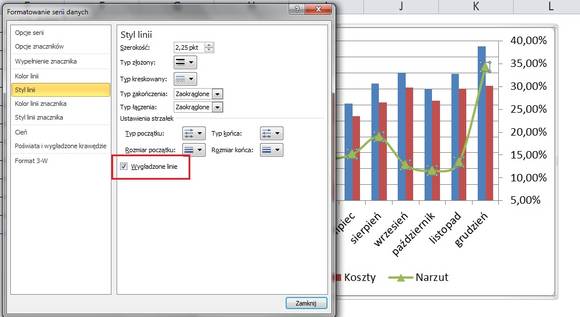 Formatuj serię danych -> Styl linii – Wygładzone linie