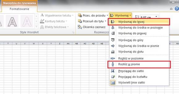 Trzymając klawisz CTRL, zaznaczamy wszystkie wykresy. Następnie z formatki Formatowanie wybieramy opcję Wyrównaj. Stamtąd, w naszym przypadku, przydatne będzie wyrównanie do lewej krawędzi, a także w pionie (zauważcie, że odstępy między wykresami są różne).