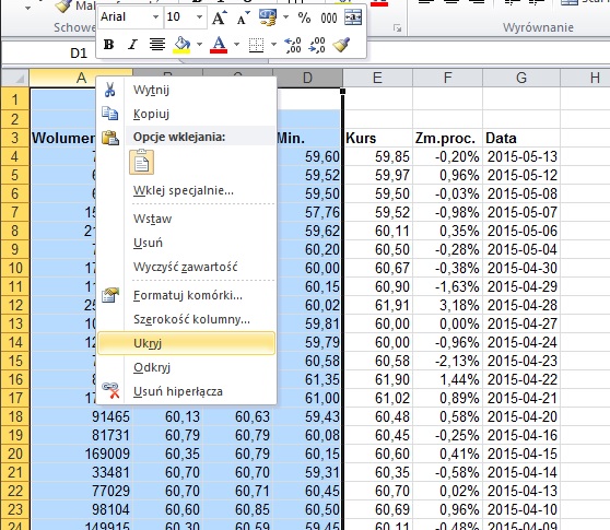 Zaznaczmy więc kolumny, które możemy ukryć. Następnie klikamy prawym klawiszem myszki „Ukryj:.