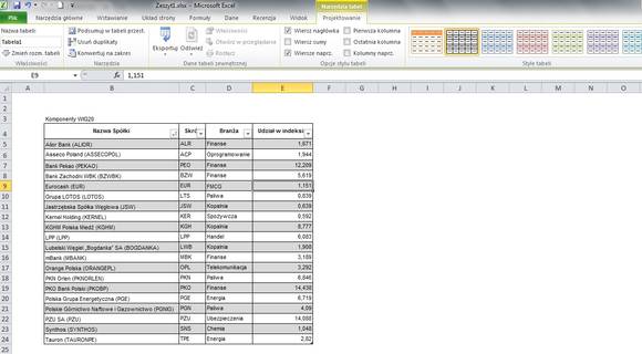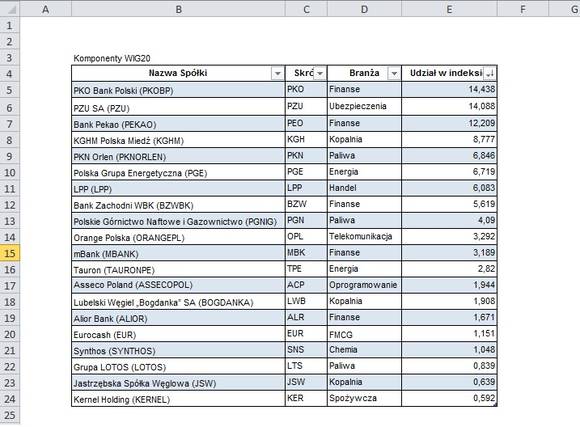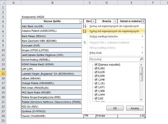Sortowanie polega na tym, że dane w tabeli (w kolumnie) są ustawiane według określonego szyku – np. alfabetycznie lub rosnąco/malejąco (Excel rozpoznaje zawartość komórek, przez co podpowiada odpowiedni rodzaj sortowania). Oczywiście jeżeli sortowaniu poddamy jedną kolumnę – jak w przykładzie poniżej, gdzie chcemy ułożyć spółki WIG20 według malejącego udziału w indeksie – to zawartość pozostałych kolumn zostanie dostosowana do tego sortowania.