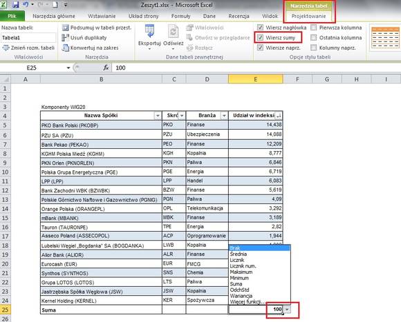 W formatce Projektowanie, o której wyżej była mowa, znajduje się ciekawa opcja – Wiersz sumy. Zatwierdzenie tej opcji doda do naszej tabeli dodatkowy wiersz, w którym sumowane będą wartości tam, gdzie jest to zasadne (w kolumnie są liczby). Warto jednak wiedzieć, że po kliknięciu w komórkę z zsumowaną wartością, pojawia się w niej ikonka z trójkątem, która umożliwia rozwinięcia kilku dodatkowych opcji. Tak oto w dodatkowym wierszu możemy w łatwy sposób uzyskać nie tylko sumę, ale np. średnią wartość pozycji z kolumny, wartość maksymalną, minimalną lub nawet odchylenie standardowe.