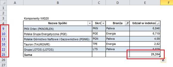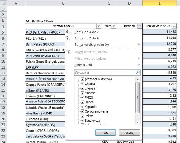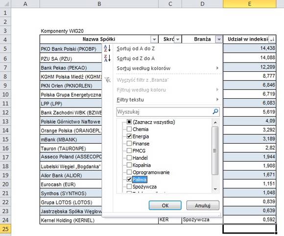 Zastosowanie filtru jest nieco inne – za jego pomocą możemy wyciągnąć z tabeli jedynie te wiersze, które spełniają określone przez nas kryterium. Powiedzmy, że spośród spółek WIG20 interesują mnie wyłącznie te, które należą do branż: Paliwa i Energia.
