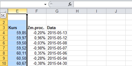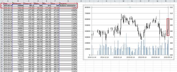Weźmy teraz trochę inny przykład. Mamy dane, na których wykonaliśmy pożądane operacje, ale które zajmują na arkuszu sporo miejsca, i które nie będą nam dalej potrzebne. Za przykład wziąłem notowania giełdowe.