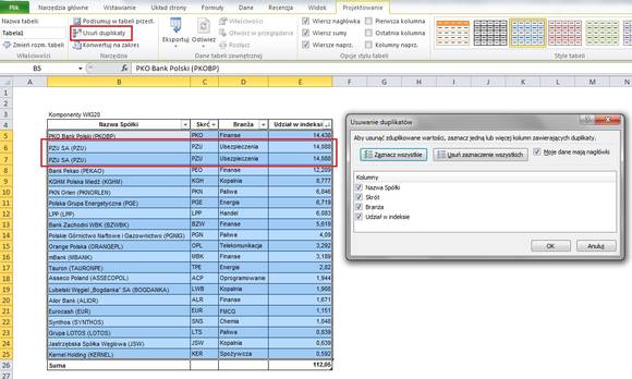 Funkcja Usuń duplikaty jest bardzo prosta w użyciu – wystarczy ją wybrać, a następnie wskazać zakres, tabelę, z której usunięte mają być duplikaty. W naszym przykładzie podwójnie w tabeli znalazła się spółka PZU, czego sobie nie życzę. Dlatego w oknie dialogowym zaznaczam, że duplikaty mają być odnalezione na podstawie kolumny „Nazwa Spółki” (zwracajcie na to uwagę). Klikając „OK” usunę cały, dodatkowy wiersz.