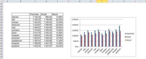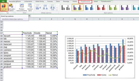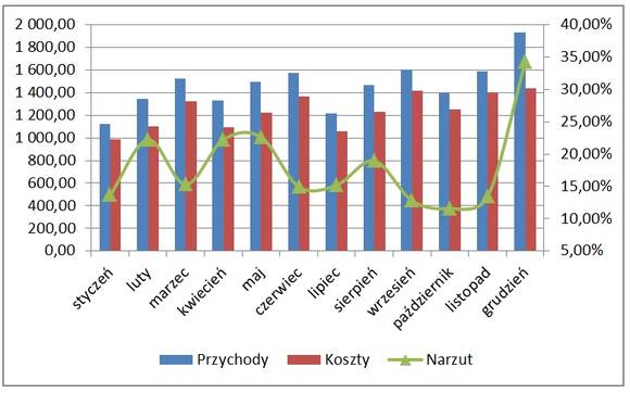 Dane wyrażone procentowo często o wiele lepiej prezentują się na wykresie liniowym. Jak zatem zrobić, by wykresy przychodów i kosztów pozostałe w formie kolumn, a na nie nakładał się wykres narzutu w postaci liniowej?