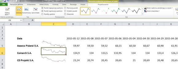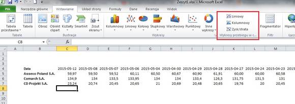 W drugiej części artykułu uwagę poświęcimy wykresom. Zacznijmy od tych najmniejszych, czyli wykresu przebiegu w czasie, który możecie uaktywnić w dowolnej komórce. Oczywiście nie będzie to pełnoprawny wykres, a jedynie pogląd kształtowania się w czasie danej zmiennej.