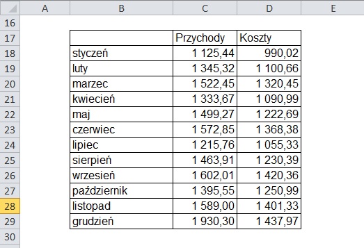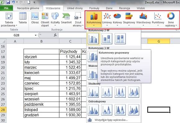 Za przykład weźmy podstawowe zestawienie przychodów i kosztów. Pierwszym problem, na który napotykamy się chcąc stworzyć wykres, to wybór odpowiedniej jego postaci. Nasz przykład jest stosunkowo prosty, ale nie oznacza to, że odpowiedź na powyższą wątpliwość jest tylko jedna. Ja jednak zakładam, że najlepiej zależności pomiędzy przychodami i kosztami, a także kształtowanie się przychodów w czasie, pokaże wykres kolumnowy. Wykresy dodajemy w następujący sposób: