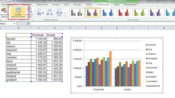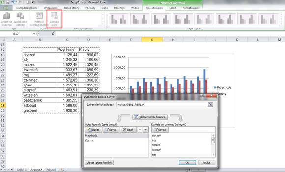 Po wybraniu wykresu należy wskazać programowi zakres danych, które mają zostać na nim przedstawione – Zaznacz dane. Jako że jest to stosunkowo prosty wykres, to Excel sam rozpozna, co powinno znaleźć się na osi X a co na osi Y. Jeżeli jednak Excel się pomyli, wówczas można bardzo łatwo zamienić wiersze z kolumnami, klikając Przełącz wiersz/kolumnę.