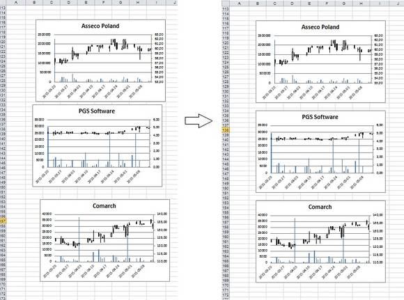Może się zdarzyć, że w waszym arkuszu będzie sporo wykresów, które „na oko” ciężko jest dobrze uporządkować. Jest na to prosty trick. Poniżej mamy właśnie taką sytuację – kilka wykresów giełdowych.