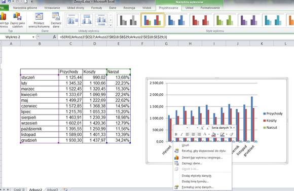 Pamiętajcie też, że klikając prawym klawiszem myszki możecie przejść tak do ustawienia całego wykresu, jak i poszczególnych jego elementów (osiom można zmieniać skalę, poszczególnym wielkościom – jak u nas przychodom – dodać linię trendu, itd.).