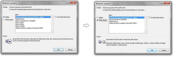 Następnie z okna dialogowego wybrać z punktu Wklej opcję Wykres programu Microsoft Excel – obiekt, a następnie to samo w polu Wklej łącze. Odtąd wykresy będą w pełni zasymilowane – wszelkie zmiany, tła, czcionki, koloru, zakresu danych, będą w czasie rzeczywistym aktualizować się w Excelu i Wordzie. Ten trick działa też z pozostałymi programami Office’a.