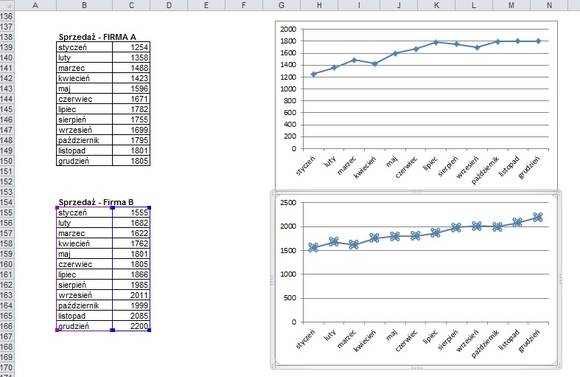 Powiedzmy, że mamy taką sytuację – mamy sprzedaż dwóch firm, odpowiadające im tabele i wykresy. Chcemy szybko porównać te wielkości, wstępnie, wizualnie. Jest bardzo łatwy sposób, który umożliwi naniesienie jednego wykresu na drugi – z zachowaniem rozsądnej skali. Wystarczy zaznaczyć funkcję jednego wykresu, przekopiować ją (CTRL + C) i wkleić (CTRL + V) na drugim wykresie.