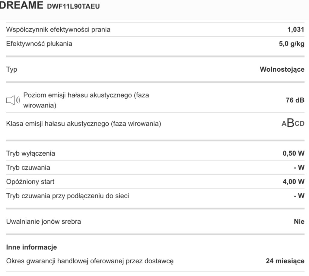 Drugim wehikułem jest aplikacja Dreame, która deklaruje zdalne sterowanie, regulację parametrów, powiadomienia w czasie rzeczywistym oraz aktualizacje. Z punktu widzenia rynku to bardzo typowe, bo Samsung opisuje podobną warstwę w SmartThings (rekomendacje cykli, planer, powiązanie prania z suszeniem, monitorowanie energii). I tu pojawia się drobna, ale istotna „dziura” w historii Dreame L9. W karcie informacyjnej UE dla DWF11L90TAEU pole „tryb czuwania przy podłączeniu do sieci (W)” ma wartość „Nie dotyczy”. To zaskakuje, bo jednocześnie oficjalne materiały produktowe mówią o sterowaniu z poziomu smartfona i aktualizacjach OTA. Najbardziej ostrożna interpretacja jest taka, że albo łączność realizowana jest w sposób, który producent nie kwalifikuje jako „networked standby” w rozumieniu kart, albo karta została wypełniona w sposób uproszczony (co w praktyce też się zdarza, choć nie powinno). Dla Ciebie – uzytkowniku – nie jest to temat do doktoryzowania się. Jeżeli pralka ma Wi‑Fi i stale „czeka” na polecenia, pobór mocy w czuwaniu może być realnym choć niskim kosztem, a konkurenci mają to jawnie wpisane w dokumenty.