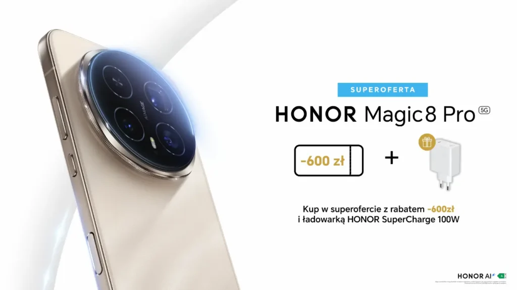 Producent przygotował ofertę obejmującą rabaty na oba modele oraz dodawaną bez dopłaty ładowarkę HONOR SuperCharge 100W. Promocja jest dostępna w Honorstore.pl oraz w popularnych sieciach sprzedaży, takich jak RTV Euro AGD, X kom, Media Expert i Komputronik. Magic8 Lite można kupić taniej o 100 zł, natomiast Magic8 Pro otrzymał obniżkę aż o 600 zł. Oferta ma charakter czasowy i kończy się 15 marca, co może zachęcić do szybszej decyzji zakupowej.