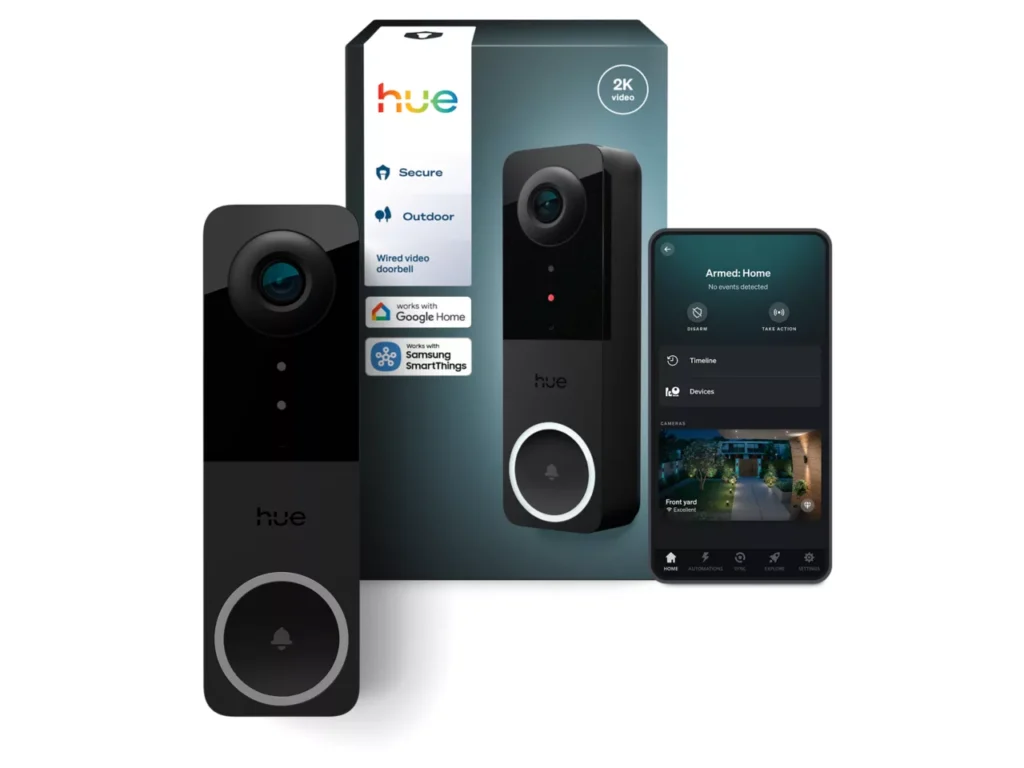 Dla wyższego bezpieczeństwa domowego do systemu inteligentnego oświetlenia i monitoringu dołączył wideodzwonek przewodowy. Urządzenie jest niewielkie, bardzo eleganckie i zostało wyposażone w szerokokątną kamerę 2K. Będzie się idealnie dogadywać z oświetleniem fasadowym Philips Hue, gdy pod drzwiami zjawią się goście. Wideodzwonek ma własny sensor ruchu, wyśle więc powiadomienie do aplikacji mobilnej, gdy nikogo nie będzie w domu. Na tę okazję umożliwia dwukierunkową komunikację audio.