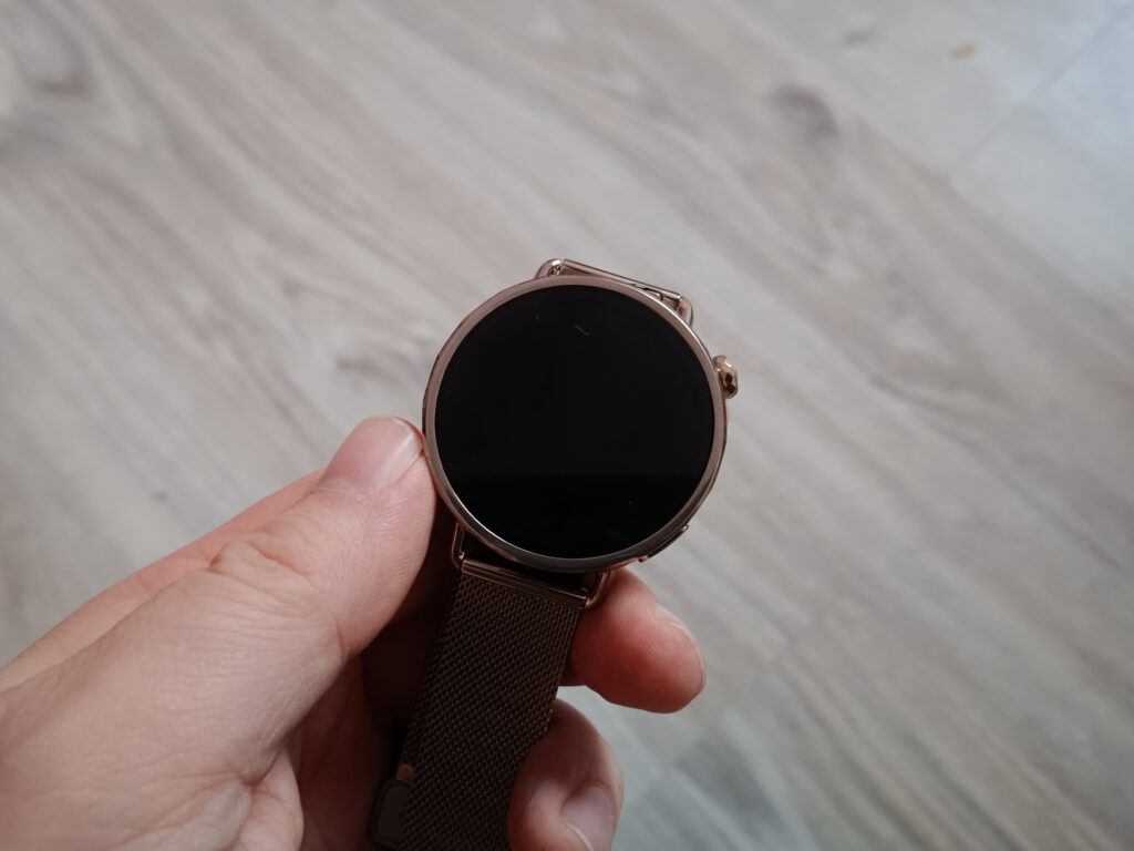 Wariant 41 mm został zaprojektowany z myślą o osobach o drobnych nadgarstkach. Smartwatch doskonale leży na ręce a zaokrąglone krawędzie koperty nie powodują dyskomfortu nawet po wielu godzinach użytkowania. Urządzenie jest niezwykle lekkie – waży bowiem zaledwie 32 gramy. Konstrukcja nie jest jednak pozbawiona wad. Koperta zegarka wykonana została w połysku. Budzi to we mnie pewien niepokój – na pewno bowiem długoterminowo może zbierać nieprzyjemne dla oka rysy.