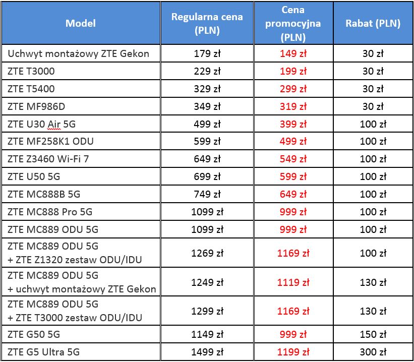 W ofercie znalazły się najświeższe modele, takie jak ZTE U30 Air 5G, ZTE G50 5G oraz flagowy ZTE G5 Ultra 5G. W promocji dostępne są również popularne, sprawdzone konstrukcje, na przykład ZTE U50 5G oraz MC888 Pro 5G.