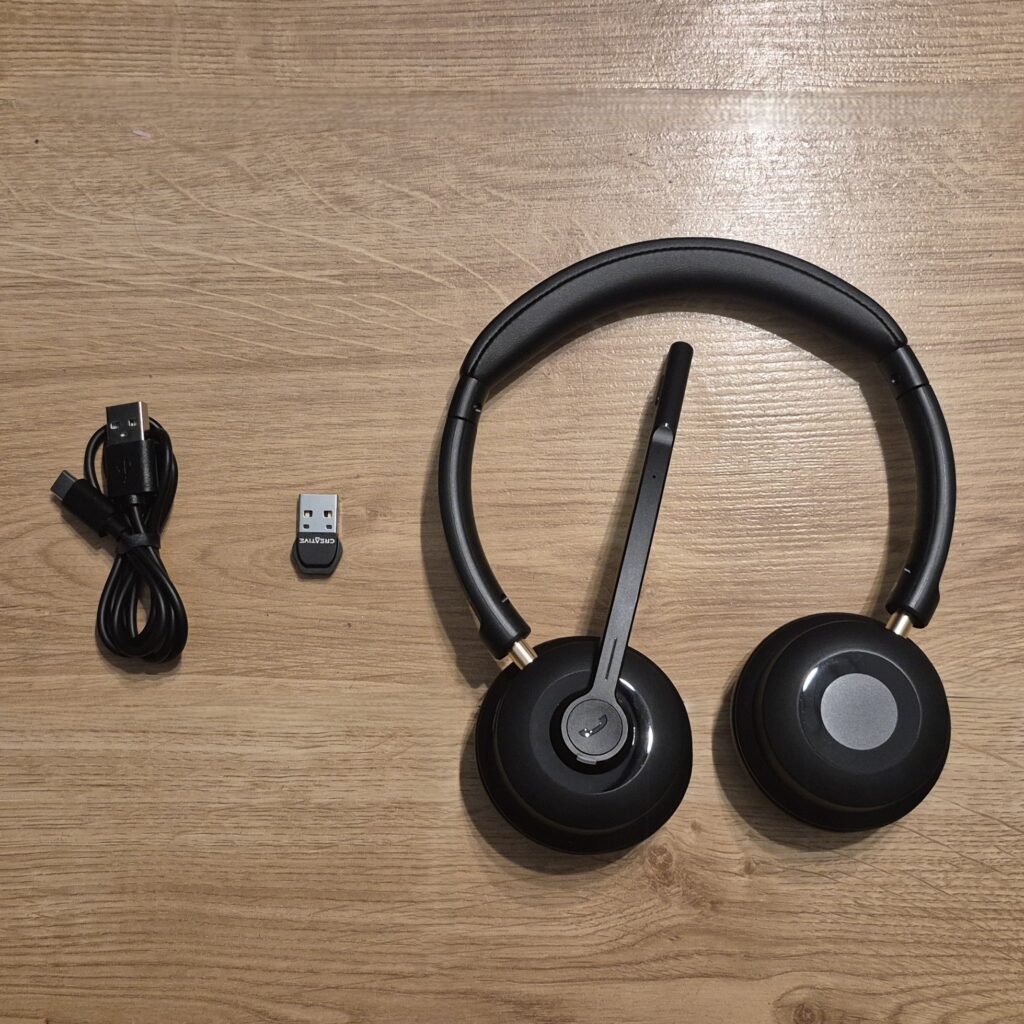 W pudełku z Creative Chat Wireless nie ma niespodzianek i trudno uznać to za wadę. Producent od początku jasno komunikuje, że mamy do czynienia z narzędziem do pracy, a nie gadżetem premium. W zestawie znajdziemy same słuchawki, bezprzewodowy adapter USB, przewód do ładowania oraz podstawową dokumentację. Brakuje etui czy dodatkowych akcesoriów, ale w tym segmencie cenowym i przy biurowym przeznaczeniu trudno uznać to za realny minus. Wszystko, co potrzebne do rozpoczęcia pracy, jest na miejscu.