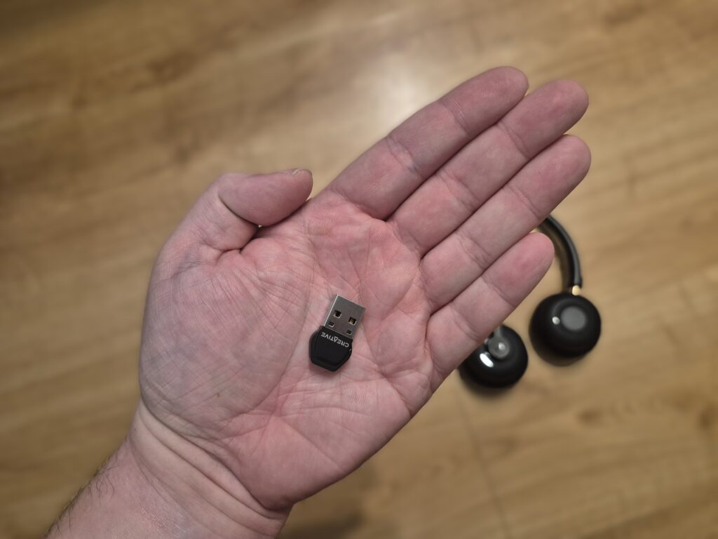 Jednym z mocniejszych punktów Creative Chat Wireless jest kwestia łączności. Producent daje do dyspozycji dwa tryby pracy. Klasyczne połączenie Bluetooth oraz dedykowany adapter USB działający w paśmie 2,4 GHz. W praktyce to bardzo rozsądne podejście, bo pozwala dopasować sposób połączenia do konkretnego scenariusza. Bluetooth sprawdzi się przy pracy z laptopem lub smartfonem, natomiast odbiornik wyraźnie celuje w użytkowników komputerów stacjonarnych.
