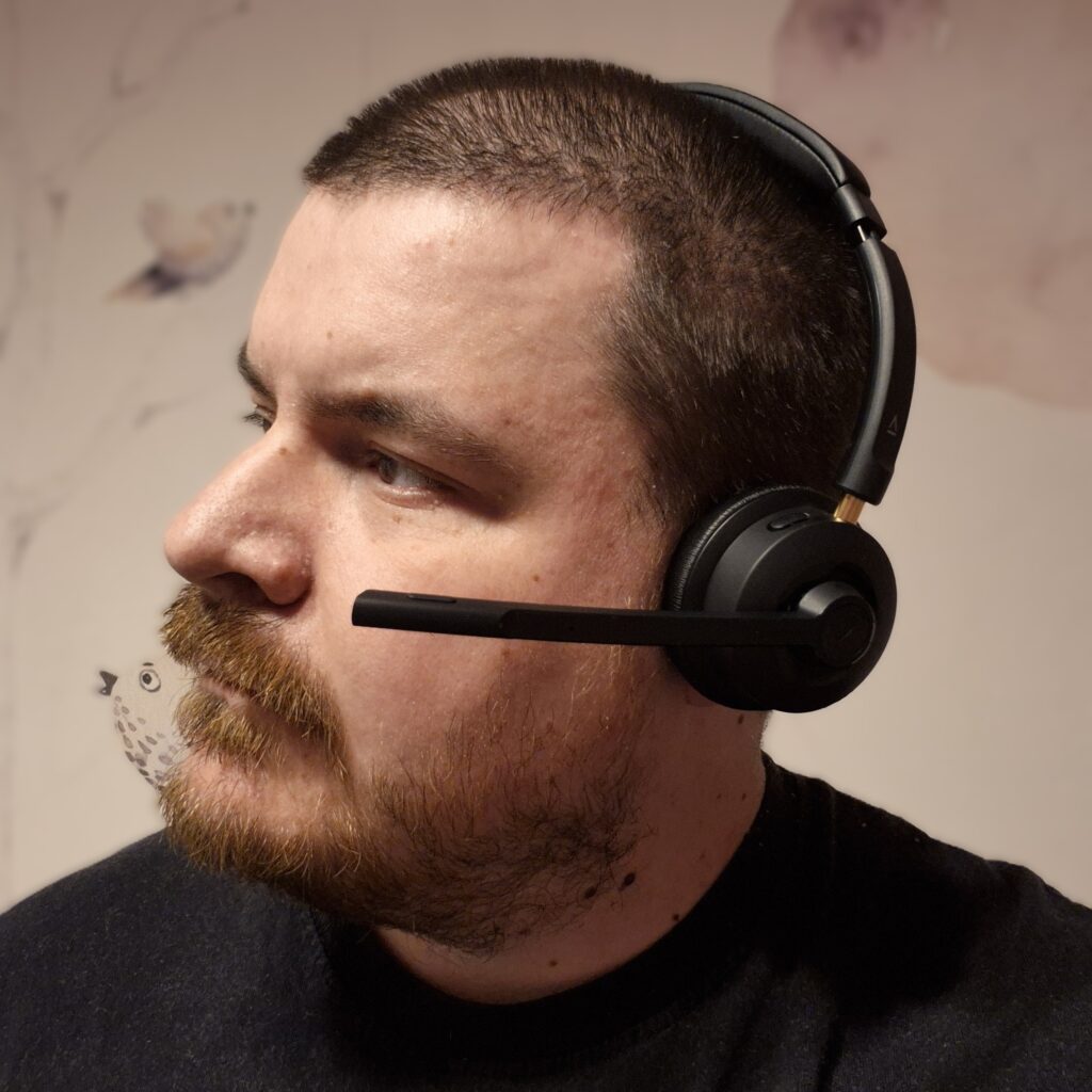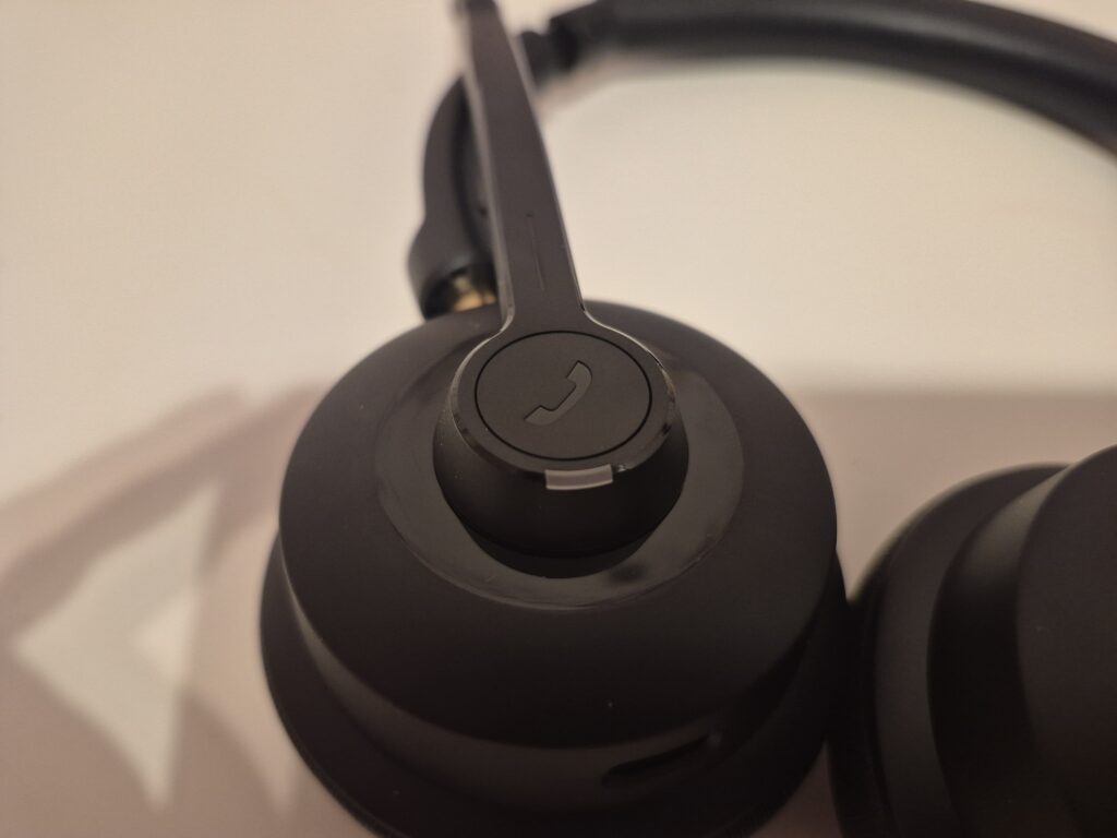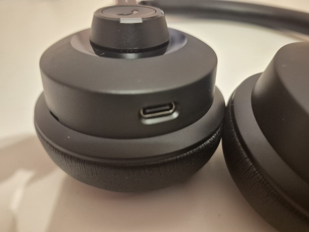 Nauszniki są miękkie i dobrze układają się wokół uszu, choć nie oferują bardzo głębokiego profilu. Przy standardowym użytkowaniu nie stanowi to problemu, ale osoby z większymi uszami mogą odczuć, że to konstrukcja bliższa półotwartej niż pełnowymiarowej. Zaletą jest natomiast dobra wentylacja. Uszy nie nagrzewają się nadmiernie, nawet po kilku godzinach ciągłych rozmów, co w biurowych warunkach bywa ważniejsze niż idealne tłumienie otoczenia.