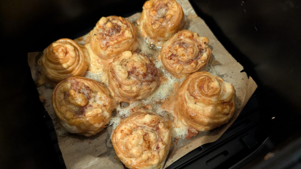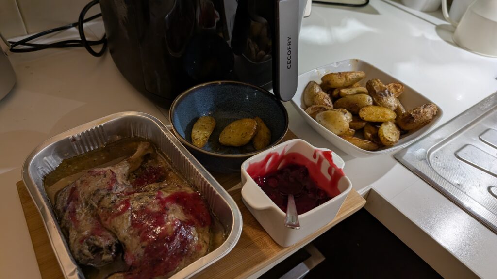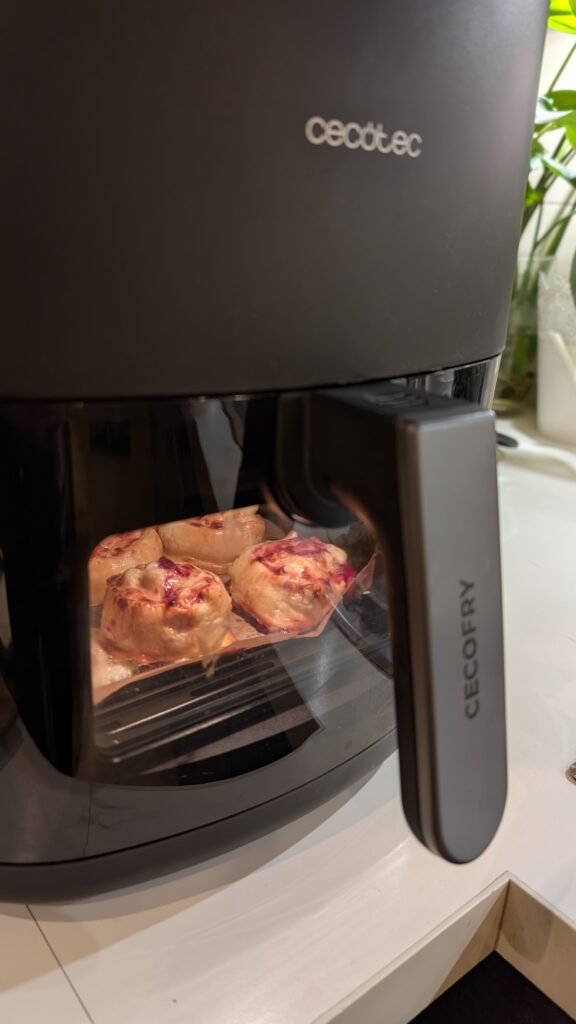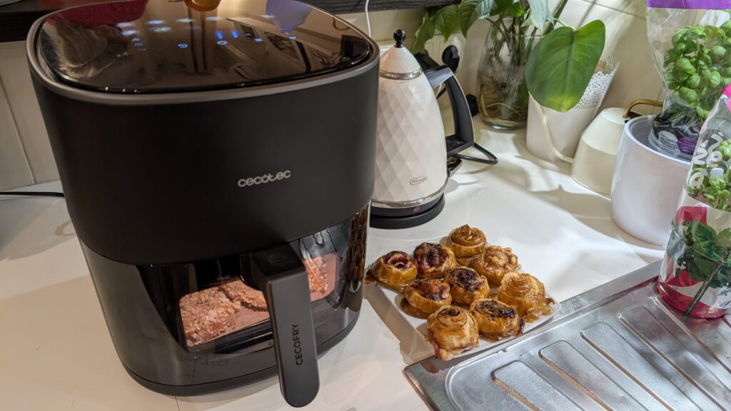 Kluczem do sukcesu modelu CecoFry&Grill Duoheat 6500 jest zastosowanie podwójnej grzałki, która gwarantuje błyskawiczne i wyjątkowo równomierne gotowanie. Jest to o tyle istotny fakt, że większość Fryerów na tylko jedną grzałkę. Dwie niezależne grzałki precyzyjnie rozprowadzają ciepło wewnątrz komory, eliminując problem niedopieczonych potraw i usprawniają cały proces. Niezależnie od tego, czy grillujesz mięso, smażysz frytki, czy pieczesz pizzę, system Duoheat zapewnia optymalny efekt: idealnie chrupiącą skórkę na zewnątrz i soczyste, dobrze wypieczone wnętrze. To rozwiązanie przenosi wygodę i szybkość przygotowywania posiłków na zupełnie nowy poziom i to się czuje zarówno w portfelu jak i na tarczy zegara. Cieplutkie bułeczki na jogurcie zrobiłem rano w 15 min, frytki w 30 min, wolno gotowaną kaczkę też w 30, przekąski z ciasta francuskiego w 12 min. Kurczaki w stylu KFC w 18 min. Generalnie łącznie z przygotowaniem potrawy nie siedziałem w kuchni dłużej niż godzina, a często maksymalne 30 min.