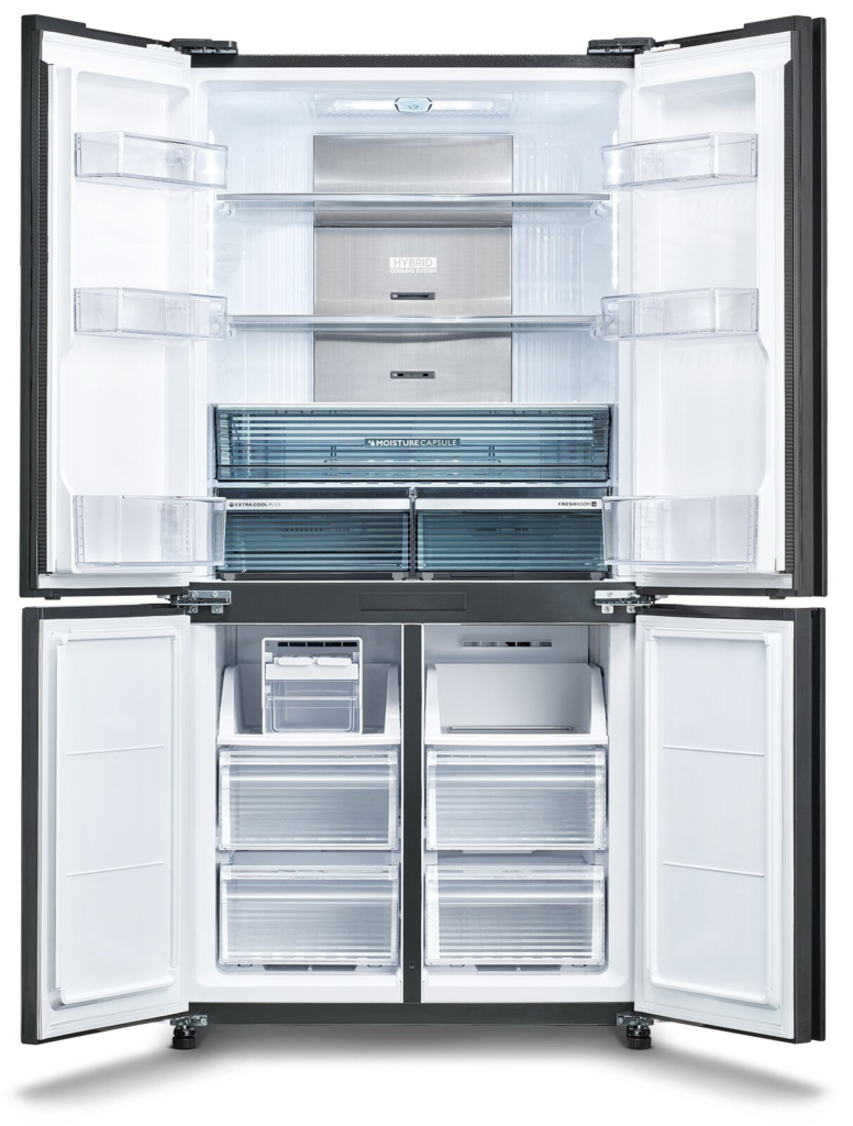 Czarne, szklane drzwi oraz specjalna konstrukcja drzwi określana jako rozwiązanie opatentowane w Japonii to sedno opisu urządzenia. Funkcjonalne eliminacja tradycyjnego słupka uszczelniającego między skrzydłami ma zmniejszać ryzyko uszkodzeń i jednocześnie pozwalać na szersze balkoniki w drzwiach bo daje więcej miejsca na wysokie i szerokie opakowania. Sharp tę kwestię sprzedaje jako element „większej pojemności użytkowej” przy tych samych wymiarach zewnętrznych.