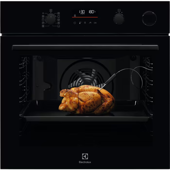 Wbudowana termosonda, czyli przewodowy czujnik temperatury potrawy, to rozwiązanie, która jeszcze niedawno była domeną piekarników z wyższej półki, a dziś coraz śmielej trafia do modeli ze średniego segmentu takich jak Electrolux EOC6H76Z. W praktyce jest to metalowy szpikulec z czujnikiem temperatury, podłączany do dedykowanego gniazda wewnątrz komory piekarnika w górnej części piekarnika. Średnio fortunnie wybrane miejsce, ponieważ w bocznej ścianie mogłoby być wygodniejsze. Po wbiciu sondy w najgrubszą część potrawy na przykład pieczeni, kurczaka czy ryby użytkownik ma możliwość ustawienia na panelu docelową temperaturę wewnętrzną. Piekarnik na bieżąco monitoruje proces, wyświetla aktualny odczyt i automatycznie kończy pieczenie po osiągnięciu zadanej wartości, sygnalizując to dźwiękiem. Takie rozwiązanie eliminuje zgadywanie i konieczność ciągłego sprawdzania potrawy (czyli otwierania drzwi i utraty temperatury, wilgotności itp.). Ryzyko niedopieczenia lub przesuszenia praktycznie znika, a rezultaty są znacznie bardziej powtarzalne. To szczególnie istotne przy mięsach, gdzie różnice kilku stopni decydują o efekcie końcowym.