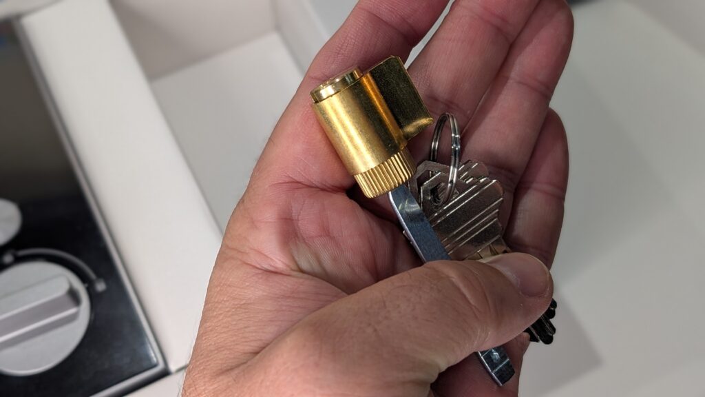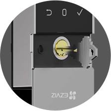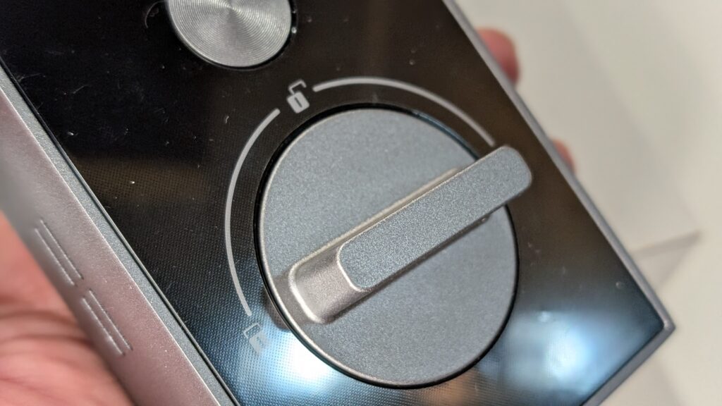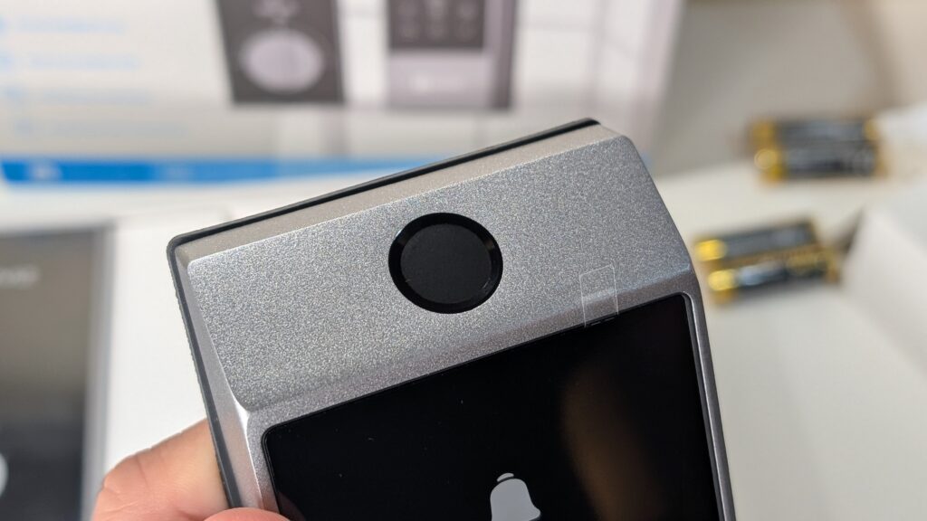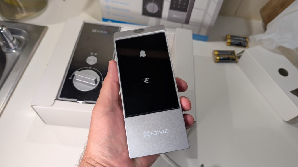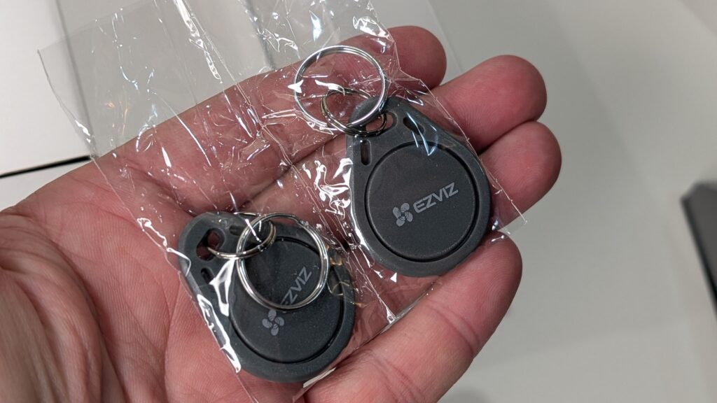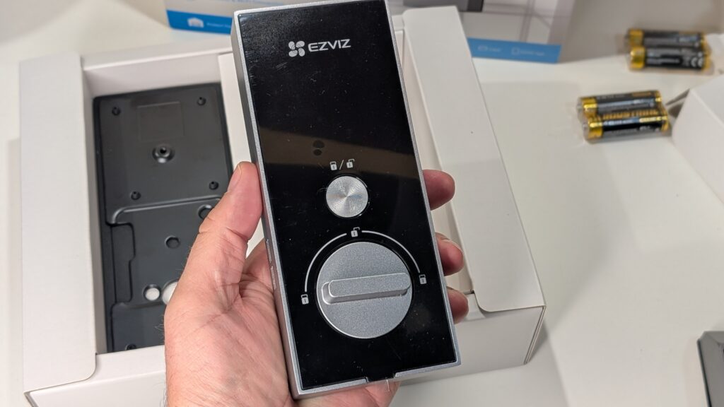 EZVIZ DL04 Pro znacząco wyróżnia się na tle konkurencji, ponieważ oferuje wyjątkowo dużo funkcji i możliwości zarządzania nim. Zewnętrzna klawiatura służy do otwierania drzwi za pomocą szyfru, tuż nad nią znajduje się czytnik linii papilarnych, który umożliwia szybkie otwarcie drzwi poprzez proste przyłożenie palca. Możemy na nim przyznać dostęp nawet 50 osobom. Do zestawu dołączone są dwa tokeny (kapsle), które wystarczy przyłożyć do zamka by się otworzył. Pod klawiaturą znajduje się stalowy dekiel, pod którym jest tradycyjny zamek na fizyczne klucze, którym możemy otwierać drzwi w przypadku wyczerpania się baterii. Ale to nie koniec, bo jest jeszcze jeden sposób na otwierania rygla i jest to możliwe przy pomocy aplikacji mobilnej.