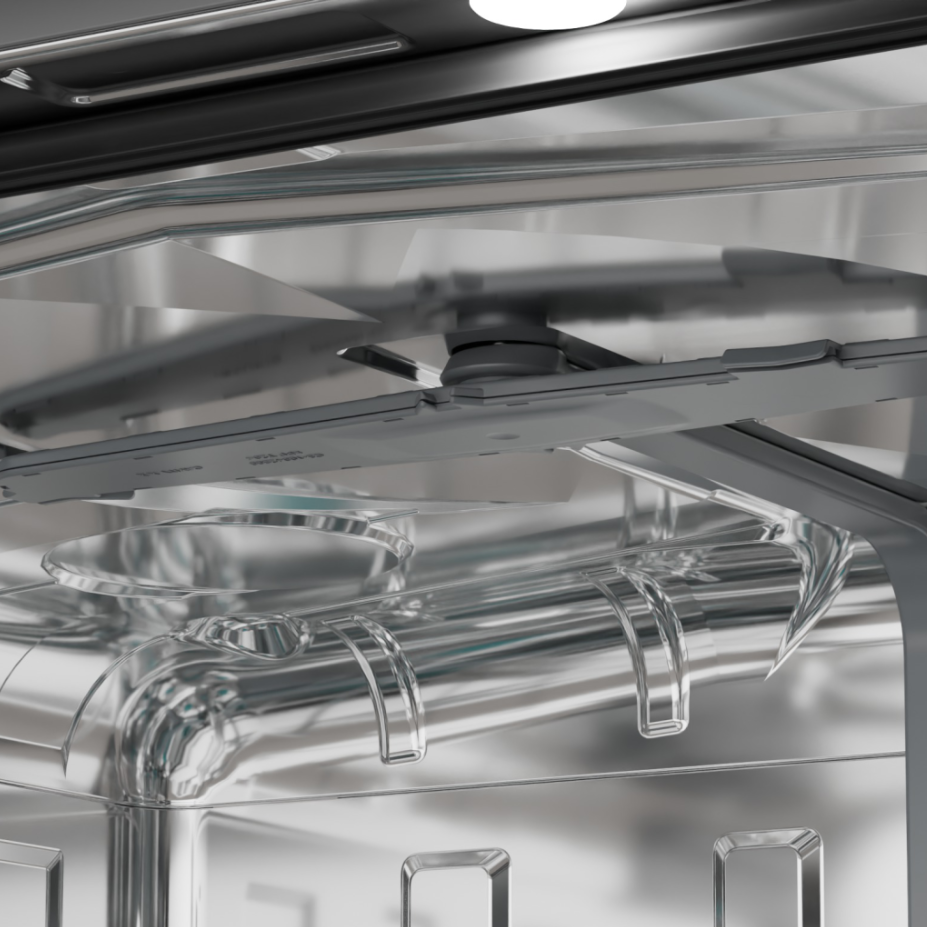 Na uwagę zasługują także specjalne strefy intensywnego mycia umieszczone w tylnej części komory. Dwie dysze wysokociśnieniowe kierują skoncentrowany strumień wody bezpośrednio na mocno zabrudzone naczynia, takie jak garnki, patelnie czy blachy do pieczenia. Funkcja ta sprawdza się również przy myciu butelek, wazonów czy akcesoriów dziecięcych, skutecznie docierając do trudno dostępnych miejsc. Użytkownik ma możliwość wyboru aktywnej strefy, dzięki czemu działanie zmywarki można precyzyjnie dopasować do układu załadunku.