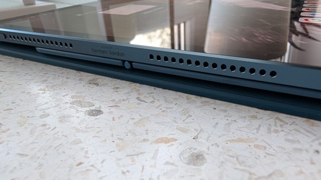 Lenovo Yoga Tab Plus od pierwszego kontaktu sprawia wrażenie urządzenia solidnego i starannie wykonanego. Jego metalowa obudowa nie tylko dodaje elegancji, ale również zapewnia odpowiednią sztywność konstrukcji. Przyciski regulacji głośności oraz przycisk zasilania, w który zintegrowano szybki i precyzyjny czytnik linii papilarnych, zostały ergonomicznie rozmieszczone na krawędziach urządzenia, zapewniając łatwy dostęp. Port ładowania USB-C, ulokowano w sposób umożliwiający wygodne korzystanie z tabletu nawet podczas uzupełniania energii. System sześciu głośników został rozmieszczony tak, aby dostarczać przestrzenny i immersyjny dźwięk. Główny moduł fotograficzny znajduje się na tylnym panelu, natomiast przednia kamera dyskretnie wkomponowana jest w górną ramkę ekranu.